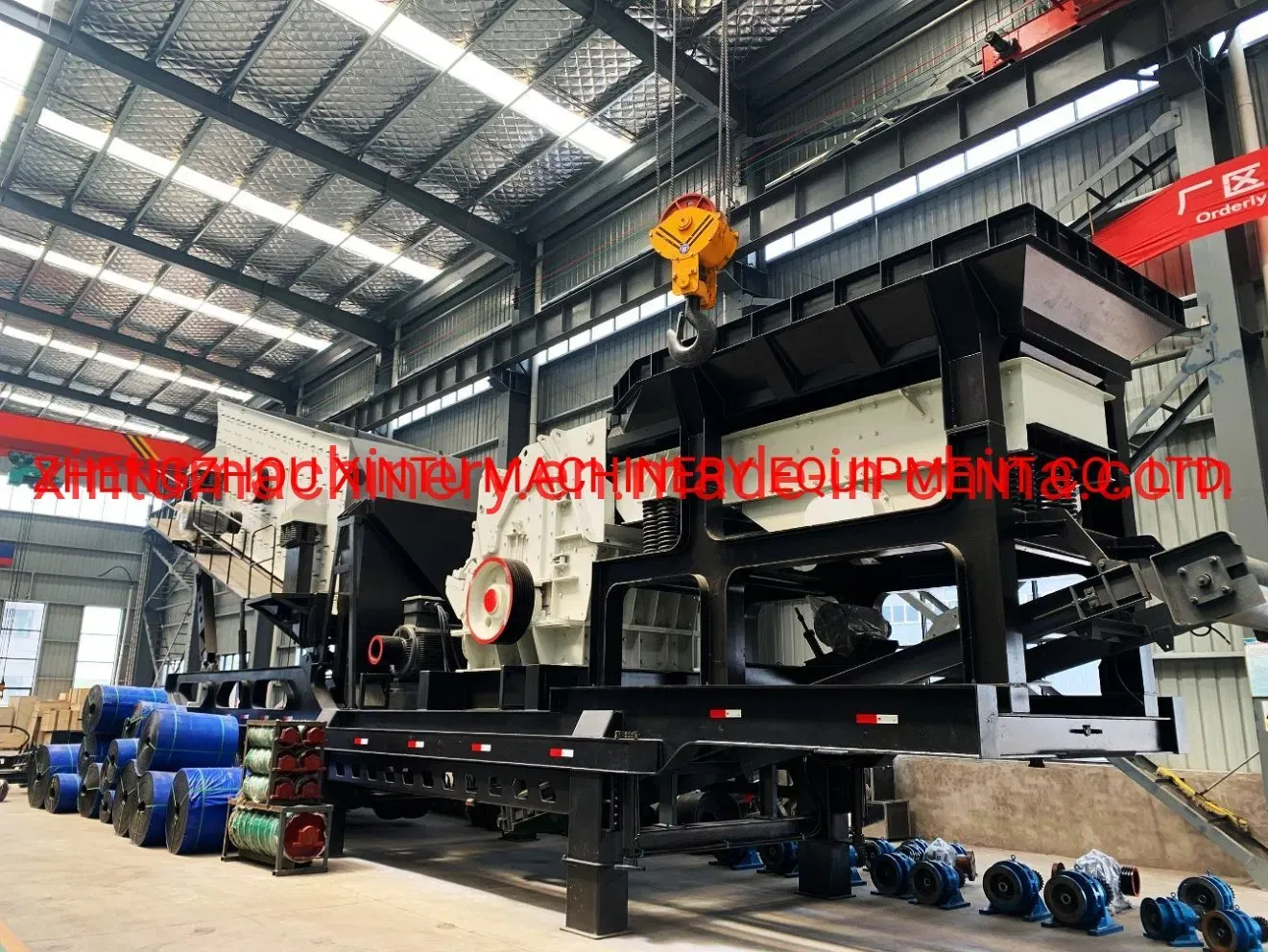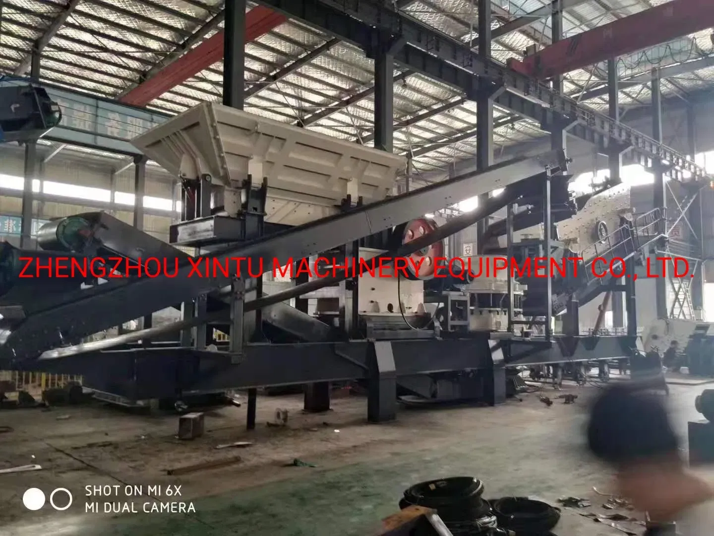 The mobile crushing plant includes vibrating feeder, stone crusher, vibrating screen, belt conveyor, magnetic separator etc. When gravel stone is fed