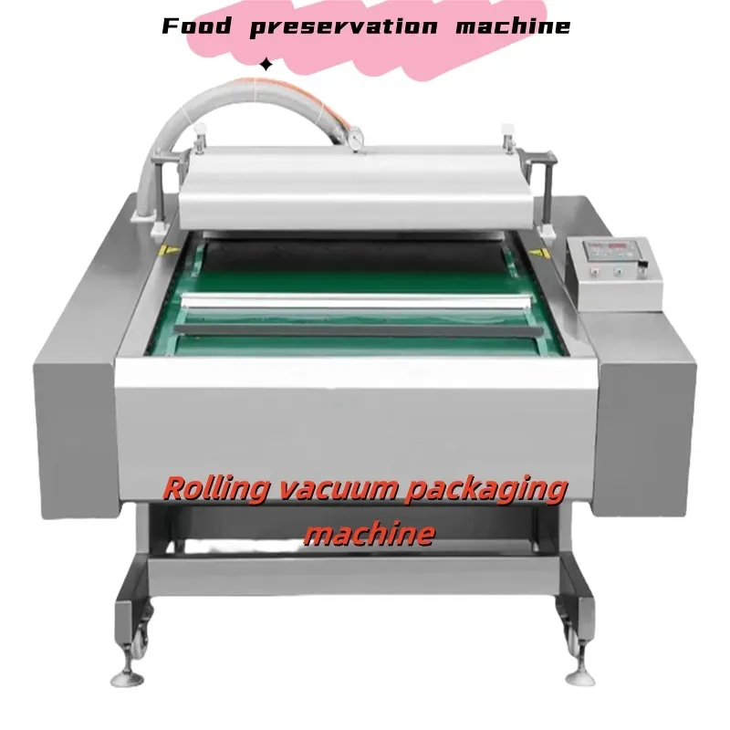 The rolling vacuum packaging machine is a fully automatic vacuum packaging machine with a sealing line length of 1100mm. The equipment has two sealing lines and can be used to package small bags of snack food. The machine has the advantages of smooth lifting, high accuracy, and accurate positioning of the rolling belt; Equipment operators do not need to manually adjust the position of the conveyor belt, which is more time-saving and labor-saving.